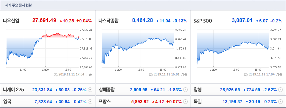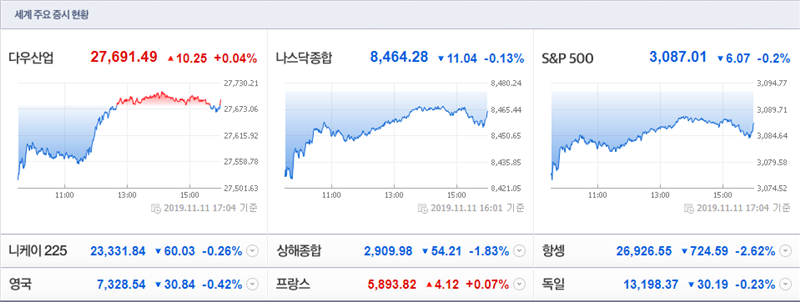 ● 11/11(현지시간) 뉴욕증시, 美/中 무역협상 불확실성 속 혼조 마감