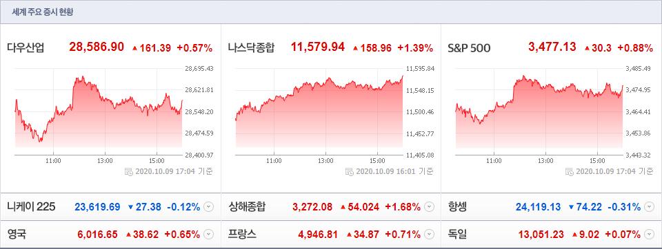 ● 10/19(현지시간) 뉴욕증시, 부양책 타결 기대감 및 바이든 당선 기대감으로 인해 상승